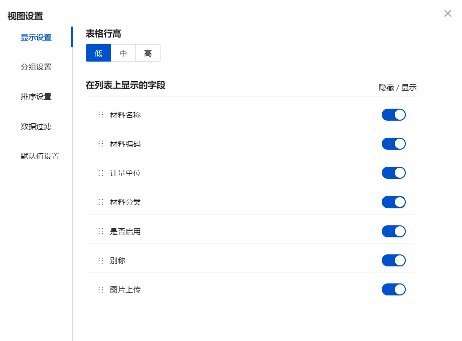 - 显示字段:勾选希望在列表表格中显示的字段,支持通过拖拽调整字段的显示顺序。