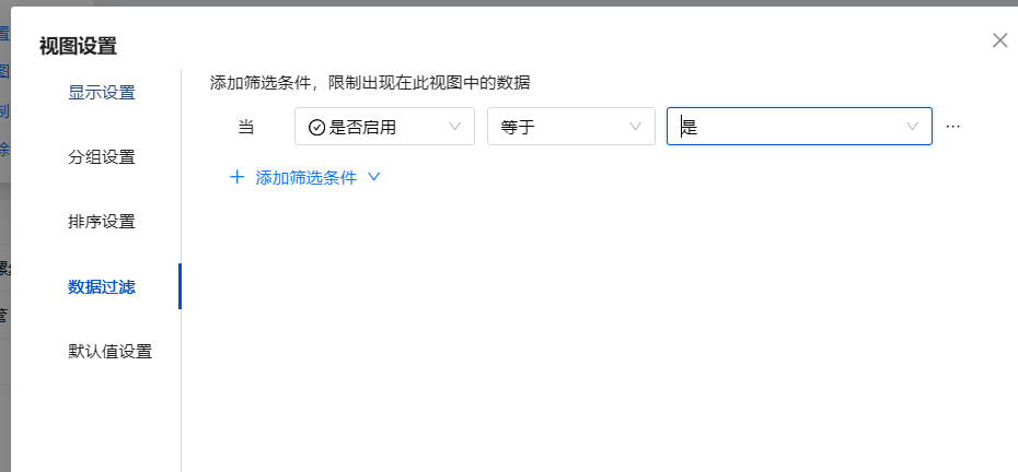 应用示例:若只想显示已启用的材料记录,可点击「添加条件」,设置:是否启用 等于 是。