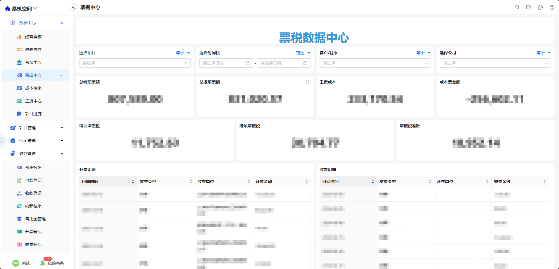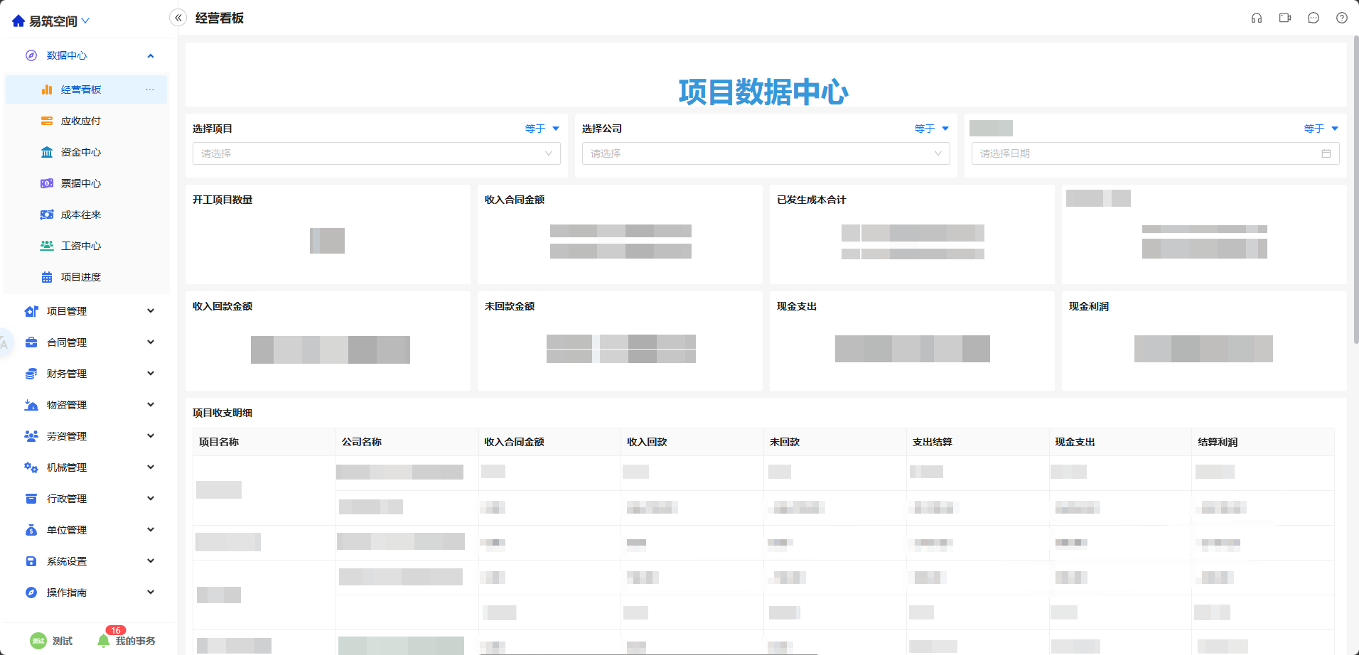 易筑空间此次选择了蓝燕云的全模块方案,项目管理、合同管理、财务管理、物资管理、劳资管理、机械管理、行政管理全面上线,并通过数据中心的经营看板、资金中心、票据中心、成本往来、工资中心等多维看板,将企业经营数据统一汇聚,管理层随时可掌握合同额、回款、支出与利润的实时状态。