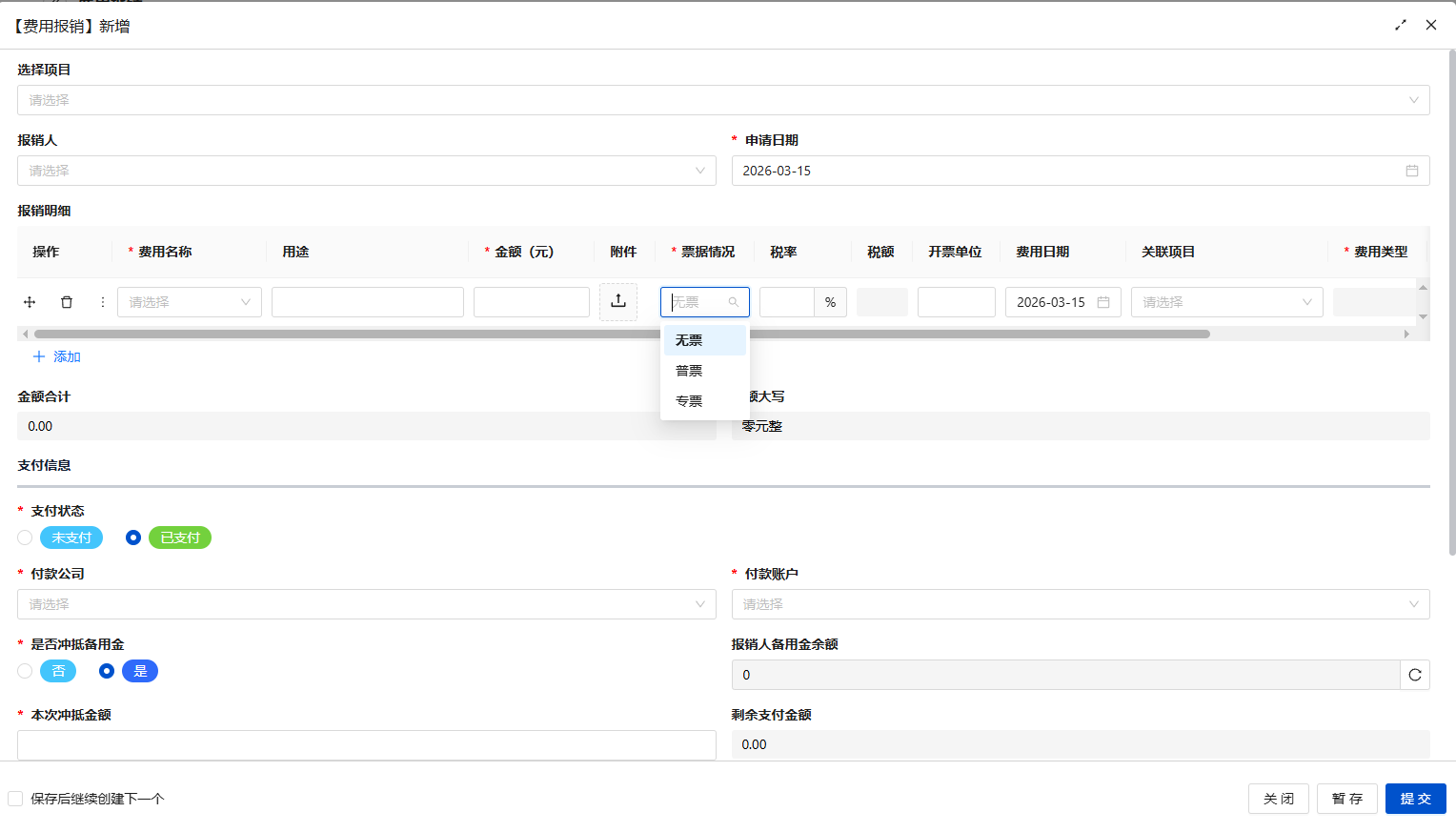 费用报销中普票、专票、无票并存的问题,在装修企业尤为突出。系统在报销环节重点强化了票据追踪与支付管控:报销单完整记录票据类型与税额,有票报销自动同步至票据中心看板,集中可查;报销单标记"已支付"时,系统强制要求上传支付凭证,确保每一笔付款都有凭证留底,资金流向清晰可溯。